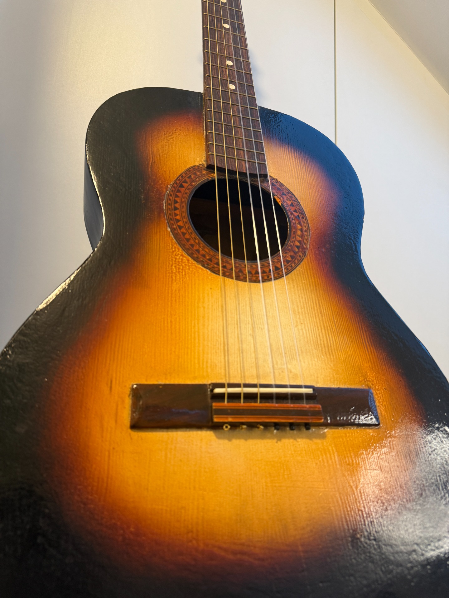 Een heerlijk gitaartje, ook een ex-verhuur gitaar. Hier heb ik het één en ander op geëxperimenteerd. Nieuwe techniek van lakken, stipjes langs de bovenkant van de nek. Perfect bespeelbaar maar cosmetisch misshien niet echt in topstaat.